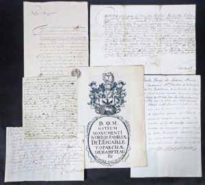 1647-1812. 10 doc. en français, de 1 à 5 pp., papiers de formats divers + 1 DESSIN ORIGINAL à la plume et au lavis gris (1 cachet sous papier, restes de cachets de cire, qqs rouss., pet. déchirures). Transcription d'une inscription funéraire jointe. Michel et François de L'Escaille, officiers de cavalerie au service de l'Espagne (8 doc. : lettre patente avec sign. autogr. et sceau du duc Charles IV de Lorraine, attestations, DESSIN d'un obit armorié, tableau généalogique.-- Famille du célèbre marquis de Gages (1739-1787), aristocrate hennuyer et grande figure de la franc-maçonnerie des Pays-Bas autrichiens (3 doc. div.).