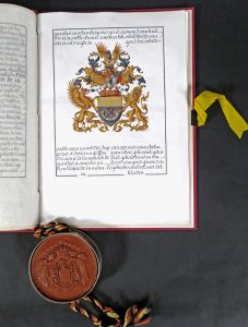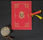 Bruxelles, 30 juillet 1934. In-f° : [4] ff., 35 x 24,5 cm, sur peau de vélin protégé de serpente, texte en français et néerlandais sur 2 col., armoiries peintes signées L. Diekmann (15 x 13,5 cm). Rel. de l'époque : pleine percaline chagrinée rouge, plat sup. cerné de filets, grands écoinçons, fleurons sur les côtés et armoiries de la Belgique frappées or au centre avec blason rehaussé de noir, plat inf. cerné d'un filet doré, chiffre couronné doré au centre, dos lisse, doublures de papier moiré blanc, cordons de soie tricolore reliées au sceau pendant en cire rouge (diam. 10 cm), sous boîtier en métal argenté et doré au chiffre de Léopold III, rubans de fermeture aux couleurs nationales, couv. cons. Sous coffret en percaline noire doublée de velours violet (percaline frottée, fermoirs lég. rouillés).