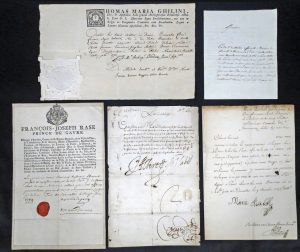 JOINT : (1). Lettre de recommandation signée du comte Thomas Marie Ghilini, nonce apostolique à Bruxelles. Brux., 6/7/1775, 1 p. in-8° oblong, en latin, en-tête imprimé (sceau sous papier).-- (2). L.a.s. du baron Alexandre-Frédéric de Seckendorff au vicomte d'Audenarde, à Paris. Brux., 3/01/1782, 4 pp. in-12°, en français (transcription jointe).-- (3). Passeport pour le notaire J.-B. Catoir, sign. autogr. de F.-J. Rase prince de Gavre. Brux., 20/06/1789, 1 p. pet. in-f°, imprimée à en-tête armorié, mentions ms., en français (entoilé, sceau de cire rouge).