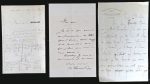 in°8 sur simple ou double f. (1). MELLERY, Xavier (1845-1921).- Lettre illustrée (2 pp.) à un inconnu (nom censuré, peut-être Frantz Charlet), Laeken, 28 janvier 1885. Mellery a écrit à Octave Maus (1856-1919) ses recommandations pour la présentation de ses oeuvres au Salon de 1885. En l'absence du secrétaire des XX, il demande à son correspondant de superviser l'accrochage de ses peintures et dessins selon un ordre précis, figuré à l'aide de deux croquis. (2 pet. manques et 1 pet. perf. au 2e f.).-- (2). STEVENS, Alfred (1823-1906).- Lettre (3 pp.) à un "Cher confrère", Paris, 27 janvier 1885. L'artiste écrit "Si j'ai tant tardé à répondre à votre lettre et à celles de Mr Maus, c'est que jusqu'au dernier moment j'espérais pouvoir envoyer des tableaux de moi à votre exposition des XX. Vous saurez que je ne peux jamais disposer d'un tableau de moi vu qu'une fois terminé il ne m'appartient plus (...)". (2 pet. déchirures sans pertes en bas).-- (3). VAN BEERS, Jan (1852-1927).- Lettre (3 pp.) à un inconnu (nom censuré), s.l.n.d. (Paris). Évoque la peinture de Khnopff "En écoutant du Schumann" (1883), oeuvre qui suscita beaucoup de remous lors des deux expositions où elle fut présentée. En 1886, une querelle éclata même à son sujet lorsqu'Ensor accusa Khnopff de plagier son tableau "La musique russe" (1881). Van Beers écrit à son correspondant "Je pense que vous auriez tort de retirer "En écoutant du Schumann" qui plait beaucoup", plus loin "Les affaires vont mal partout mais à Londres il y a toujours plus d'argents et d'amateurs [...]. Ne voyez vous pas de bons tableaux de vos amis à envoyer à Londres?". (part. collée sur carton de support, déchirure sans perte renforcée au milieu du 1er f.).-- (4). REGOYOS, Dario de (1857-1913).- Lettre (2pp.) sur papier à en-tête à un inconnu (nom censuré, peut-être Frantz Charlet), Paris, 23 mai. "Hier en quittant Bruxelles, j'ai su par Van Strydonck que tu as été chez des chics types à Paris". Il lui demande ensuite une recommandation pour un peintre "celui que tu trouves le plus gentil" et à une lettre pour Cladel de Mme Picard. Il souhaiterait enfin savoir s'il y a encore des "jeunes gens belges des XX" à Paris.