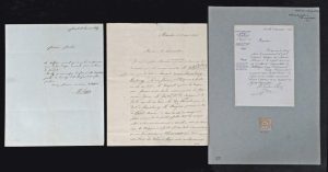 [ 1831-1873]. 3 ff. ms., 1 gravure sur cuivre, 4 lithographies (qqs collées sur papier de support, pet. taches). Sous farde. (1). Lettre autographe écrite par Vandermaelen le 26 avril 1866 confirmant la réception d'un "Catalogue des monnaies obsidiennes". Joint : ex-libris de l'établissement.-- (2). Lettre du représentant Van Luyck avec les noms de souscripteurs.-- (3). Lettre concernant "le bois d'acajou pour un bureau du président" par Jaspar.-- (4). MEERSMAN, F. De.- Portrait de Vandermaelen. [Bruxelles], Ch. Wittmann, [1873]. Gravure sur cuivre, extraite de l'"Annuaire de l'Académie royale de Belgique".-- (5). Prospectus pour la carte de la Belgique d'après Ferraris.-- (6). Prospectus pour la nouvelle carte de la Hollande d'après Krayenhoff.-- (7). Vue de l'établissement géographique de Bruxelles. Épreuve d'essai tirée sur le dos d'une carte.