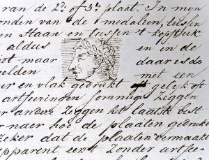 18e-19e siècles. 2 pièces : 4 pp. in-4° en néerlandais (petit dessin à la plume), 1 p. in-12° en français (plis, fentes, rouss. sans gravité, cachets postaux et restes de cachet de cire). En feuilles. (1). Notes sur l'édition d'un recueil de numismatique ("boek van de Roomse Keizers en Griekse dito") d'Hubert Goltzius, signées van der Vinne (p. 3).-- (2). L.a.s. de Weissenbruch père, imprimeur du roi, passant commande de matériel au typographe parisien Charles Derriey. Bruxelles, 13/10/1845.