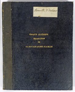 1859]. In-4° : 35 pp. sur papier bleu (rares pet. mouill. marg. ou taches). Rel. de l'époque : demi-chagrin noir, plats de percaline chagrinée bleue, plat sup. titré doré "Croquis algériens/ Traduction/ de/ S.A. Royale le Duc d'Aumale", dos lisse avec filets à froid et dorés (rel. frottée, charnière sup. fendue, manque à la coiffe sup., étiq. collée sur le plat sup.). TRADUCTION INÉDITE par Henri d'Orléans présentant des extraits choisis des "Sketches of Algeria during the Kabyle war" (London, Chapman and Hall, 1858) du colonel Walmsley et entremêlée de commentaires personnels ou de résumés des passages non traduits (des derniers accompagnés d'un trait dans la marge). Ces "Croquis algériens" interpellèrent certainement Henri d'Orléans puisque, la France s'étant lancée dès 1830 à la conquête de l'Algérie, il s'y distingua en recevant la reddition d'Abd El-Kader en 1847.