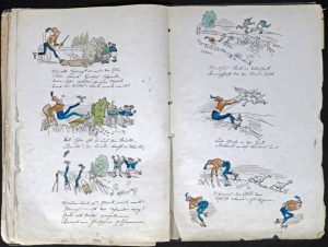 Copie manuscrite reproduisant soigneusement les textes et dessins des 3 premiers récits du célèbre livre d'enfants "Max und Moritz, eine Bubengeschichte in sieben Streichen".