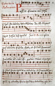 S.l., [ 17e siècle]. In-8° : 151-[5] pp. (rares taches, pet. déchirures margin. à qqs ff., papillons imprimés ou mss collés sur les lignes de texte des 20 dernières pages). Rel. de l'époque : plein parchemin, lacets de fermeture en cuir, titre ms. sur le dos (parchemin lég. souillé, plats bâillants, pet. trou au bas du dos, pet. lacune au parchemin de la coiffe sup., 2 lacets manquants). Antiphonaire de petit format comprenant les chants des offices de la Semaine sainte et du jour de Pâques, suivis des Lamentations de Jérémie, traditionnellement chantées aux matines des Jeudi, Vendredi et Samedi saints. Les partitions, en notation neumatique carrée sur des portées à quatre lignes, caractéristiques du chant grégorien, sont composées à l'encre rouge pour les portées et brune pour les neumes. Les textes en latin sont lisiblement composés à l'encre brune et rouge. Dans la partie des Lamentations, le texte initial a été entièrement recouvert par des bandelettes de texte imprimé ou manuscrit, avec quelques ajouts à la notation musicale (pp. 131-133), actualisation opérée probablement vers la fin du XVIIIe siècle.