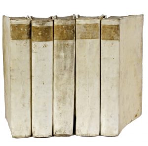 Paris, Pierre Gandouin, 1732. 5 vol. in-f° (n.c., pet. rouss. et qqs piqûres, vol. +/- brunis par endroits, cachets monogrammés sur les titres, inscription ms. grattée sur le titre du vol. I, rares déch. marg. restaurées, fin du vol. IV fort défraîchi : nombreuses mouill. marg. et moisissures). Rel. de l'époque : plein vélin à couture apparente, dos lisses avec étiq. de cuir titrées dorées, tr. bleues (rel frottée de manière +/- étendue selon les vol., moisissures au plat inf. du vol. IV, rares pet. manques de vélin). Dictionnaire explicatif du français avec les termes correspondant en latin (éd. orig. : 1704, 3 vol.). Les auteurs probablement des jésuites parisiens, expliquent que l'intérêt de l'ouvrage réside dans le fait qu'il s'intéresse aussi aux termes de médecine, rhétorique, philosophie, astronomie, botanique, littérature, etc. contrairement au Dictionnaire de l'Académie française.