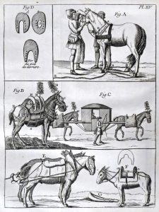 Paris, Didot (impr. de Moreau), 1770. In-4° : [36]-641 pp.,;49 h.-t. (complet des pl. et du f. *X2, qqs inversions ou erreurs de numérotation de pl., qqs ff. lég. jaunis et qqs taches). Rel. de l'époque : plein veau, dos fleuronné doré à nerfs, tr. rouges (rel. us., coins et coupes émoussés, mors frottés voire à nu, coiffes partiellement manquantes, qqs épidermures). Ouvrage de référence en matière d'hippologie (éd. orig. : 1741) dû au capitaine des haras de France, de Garsault (1693-1778), composé de traités sur l'anatomie du cheval, sur le haras, le cavalier, le vétérinaire et le chirurgien, le maréchal-ferrant et illustré de 29 eaux-fortes dépliantes. Le traité de l'"apothicaire" est illustré de 20 eaux-fortes figurant les plantes nécessaires aux soins du cheval. In fine, dictionnaire des termes de cavalerie. Cette édition parut aussi sous les noms des libraires Despilly ou Debure et une autre édition, aussi mentionnée comme la 4e, parut en 1771 en 634 pp.