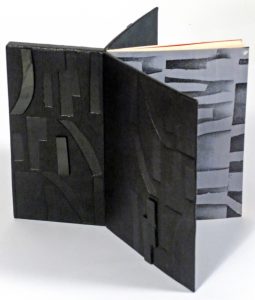 Liège, Éditions Dynamo, P. Aelberts, (22 février 1957). In-12°. Relié par Marie-Thérèse Vercheval : ex. (19,5 x 14 cm) relié dans la partie gauche à un bloc (19,5 x 9,5 cm), le tout couvert de chagrin noir décoré de formes abstraites par empreintes en creux ou inclusions de plastique noir, couv. cons. Sous emboîtage en toile rouge doublée de peau sciée rouge. ÉDITION ORIGINALE de cette étude sur Lautréamont. Numéro 43 de la collection "Brimborions" à la mémoire de Larbaud qui venait de décéder (1881-1957). Tirage à 51 ex., un des 10 de TÊTE sur Hollande, après un ex. sur Japon (n° 6).