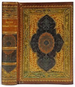 Reliure : N° 1, 2, 4 : veau brun ou bleu nuit, plats sup. et dos à nerfs finement et richement fleuronnés dorés avec listels et petites mosaïques diverses dans des styles inspirés par la Renaissance ou le Baroque, plats inf. estampés à froid de décors floraux, doublures de reps gris à cadres de veau fleuronné doré, gardes de même reps, t. dorées, sous étuis.-- N° 3 : basane brune à décors mauresques, plats sur ais de bois avec reliefs et creux dorés avec éléments peints, doublures de soie moirée brune à cadres de veau fleuronné doré, garde de même soie, t. dorée (dos et fermoirs manquants).-- N° 5 : basane brune, rel. d'inspiration médiévale sur ais de bois biseautés, dos à nerfs prolongés sur les plats en relief, fermoirs en métal, t. dorée, sous emboîtage.-- N° 6 : bradel demi-toile beige et plats de papier avec bandes peintes (fermoirs manquants). (1). FLAUBERT, G.- Madame Bovary. Douze compositions par Albert Fourié. Paris, Quantin, 1885.-- (2). BAUDELAIRE, Ch.- Les fleurs du mal, portrait de Baudelaire. P., Bibliophiles parisiens, 1921.-- (3). MUSSET, Alfr. de.- Les nuits, front. par O.D.V. Guillonnet, ornements de Léon Lebègue. Paris, Ferroud, 1912. Ex. num.-- (4). BAUDELAIRE, Ch.- "Les fleurs du mal, petits poèmes en prose, les paradis artificiels". (London), The Casanova Society, 1925. En anglais; ex. num.-- (5). [Idem].- Les fleurs du mal, illustr. de Rochegrosse. Paris, Ferroud, 1928. Portrait de l'auteur en front.-- (6). La Guirlande des années. Images d'hier et pages d'aujourd'hui, 25 chefs d'oeuvre de la miniature. P., Flammarion, (1941).
