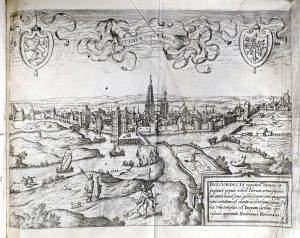 Amstelodami, apud Joannem Janssonium, 1625. In-f° : [8 dont titre gravé]-454-[10] pp.; 98 (sur 100) h.-t. (incomplet des rares pl. 61 et 73, pl. de Bergen-op-Zoom floue, perforation dans la pl. 36, déch., le plus souvent marg., restaurées ou renforcées, gouttière du titre renforcée, plusieurs pp. lég. brunies, taches et qqs mouill., rares piqûres, note ms. au faux titre). Rel. de l'époque : plein vélin, dos lisse, tr. jaspées de rouge (lacets de fermeture manquants, pet. défauts, notes mss sur la garde sup.). Traduction de François de Belleforest (1530-1583) illustrée de 98 eaux-fortes sur simples ou doubles pages reprises à l'édition latine de Blaeu (Amst., Janssonius, 1613). Figurent des cartes, plans de villes et des monuments de Gand, Ostende, Tournai, Bruxelles, Louvain, Dordrecht, Arras, (hôtel de ville), Anvers (bourse et cathédrale), etc. L'édition originale en italien parut en 1567.