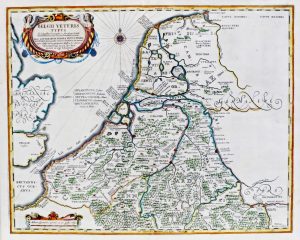 Gravure sur cuivre, TC 37,5 x 47,5 cm + marges, rehaussée à l'aquarelle (pli central). Sous passe-partout, vitre et cadre de bois doré. Représentation de la Gaule Belgique composée sur base de sources antiques. Jolie carte gravée par Petrus Kaerius, agrémentée d'un cartouche. Extraite d'une édition de l'"Appendix Atlantis" (1636/1637) ou de l'"Atlas Novus" (1638-1649) par Joannes Janssonnius.