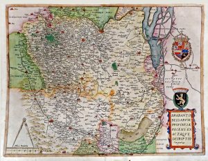 [ Anvers, Gerard de Jode, 1593]. Gravure sur cuivre, TC 35,4 x 49,8 cm + marges, rehaussée à l'aquarelle (pli central, bords collés sur papier de support). RARE CARTE DU BRABANT orientée vers l'ouest. La province est circonscrite par la Meuse à l'est et au nord, l'Escaut à l'ouest et la Sambre au sud. Extraite de la 2e édition du "Speculum orbis terrarum" (1re éd. : 1578). Comme d'habitude, les cartes de Gerard de Jode sont fondées sur des modèles allemands ou italiens. Ainsi la carte du Brabant par Jacob van Deventer (Anvers, 1546) fut rééditée par Michele Tramezzini en 1558 avant d'être reprise par de Jode.