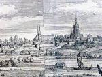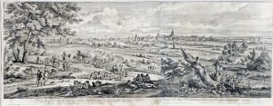 Paris, chez l'Auteur, 1685. Eau-forte, cuv. 51,5 x 133,5, cm, 2 feuilles assemblées (restaurations, 4 déchirures, ombres brunes dans le bas). Sous passe-partout, vitre et cadre de bois brun. Importante vue panoramique de Courtrai prise d'une butte occupée par des militaires avec chevaux et chars. Extraite du recueil "Veues servantes à l'histoire de Louis XIV", faisant partie de la prestigieuse collection connue sous le titre de "Cabinet du Roi".