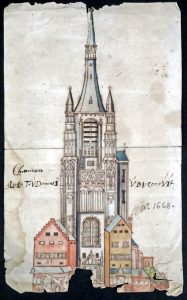 Trois dessins originaux donnant des reconstructions historiques de la tour de l'église Notre-Dame de Saint-Trond avant son effondrement en 1668. Plume d'encre brune, 1 dessin rehaussé, papier vergé (défraîchis, pliures, taches, 1 f. en 2 moitiés avec bords horizontaux effrangés).