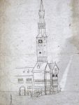 ORIGINELE TEKENINGEN, pen van bruine inkt, 1 blad gehoogd in kleur, c. 27 x 17 cm, Hollands papier (licht gebruind en gevlekt, vouwen, 1 blad horizontaal doormidden en met gerafelde onder- en bovenrand). Interessante studietekeningen met historische reconstructies, 1 met jaartal "1606" onder het torenuurwerk, 1 met getranscibeerd chronogram "1668", het jaartal van de instorting van de toren.