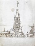 3 historische aanzichten (2 frontaal en 1 zij) van de toren van de O.-L.-V.-kerk van Sint-Truiden, 19de eeuw.