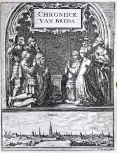 RELIÉ AVEC : (2). HAVERMANS, Adrian.- Kort begrip van de historie van Brabant. Leyden, W.C. vander Boxe, 1652. [8]-44 pp.-- (3). Bredaesche almanac en chronyck. S.l., s.n., [1664]. Deux frontispices gravés, [4]-28 pp.; 1 pl. sur double page (2e f. lim. et titre gravé reliés entre pp. 12-13). Rarissime et curieux ouvrage comportant une carte du comté de Breda avec le plan de la ville, 2 frontispices signés A. Santvoort l'un figurant le panorama de Breda et l'autre un vendeur de "Frieske spreeckwoorden".