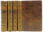 La Haye, Chrétien Van Lom, 1724 [- 1726]. 4 vol. (dont 2 suppl.) in-f° : front.-[14]-672-235-[24], [4]-572, [4]-508, [2]-444-xxxiii pp. (qqs pp. brunies, rousseurs en gouttière, qqs piqûres et mouillures passim, pagination fantaisiste sans manque). Rel de l'époque : plein veau tacheté, dos fleuronnés dorés à nerfs, tranches jaspées de bleu et rouge (plats lég. frottés, coins émoussés, coiffe sup. manquante à deux vol., us.). Édition la plus complète de cet ouvrage généalogique et héraldique sur la noblesse brabançonne du XVIIe siècle. Illustré de 75 hors-texte, 8 pleines pages et nombreux in texto. Volume I : titre allégorique figurant le Brabant entre Charlemagne et St-Albert par M. Borrekens d'après Abraham van Diepenbeke,- portrait du prince de Rumbempré (vignette),- portrait de l'auteur par J. Harrewyn d'après Abr. van Diepenbeke,- carte dépliante du duché de Brabant,- 6 pleines pages de stèles funéraires.— Volume II : 9 pll. d'armoiries (dont une dépl.) et 1 planche figurant une épitaphe.— Volume III : carte dépliante de la forêt de Soignes,- 17 vues de châteaux sur 16 h.-t.,- 3 planches d'épitaphes et intérieurs d'églises.— Volume IV : 2 pll. dépl. de châteaux,- 5 (sur 7) pll. d'épitaphes et monuments funéraires,- 8 pll. d'armoiries,- 1 double page (pp. 370-371) figurant vraisemblablement les hérauts d'armes ayant assisté à la signature de la Pragmatique sanction,- 1 double planche de costumes de rois et hérauts d'armes,- 27 portraits (cardinal Granvelle, archevêque Hovius...). Nombreux sceaux et armoiries in texto. Outre une histoire des familles qui régnèrent sur ce duché, l'ouvrage aborde également leurs relations avec les autres familles régnantes, leurs vassaux, leurs alliés et les administrations de leurs possessions.