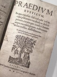 [ESTIENNE (Charles)]. Praedium rusticum, in quo cujusvis soli vel culti vel inculti plantarum vocabula ac descriptiones, earumque conserendarum atque excolendarum instrumenta suo ordine describuntur, Paris, Charles Estienne, 1554. In-8 dans une...