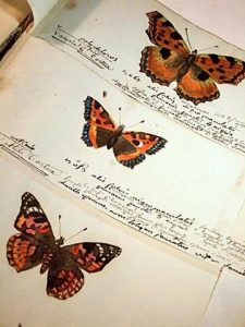 Ensemble d'environ 200 feuillets de divers formats, brochés ensembles, qui sont des compositions originales ou des gravures représentant une large variété d'insectes et de papillons, en grande majorité aquarellées avec soin à la main et complétés de notes scientifiques manuscrites qui semblent être des observations originales sur chaque espèce représentée. L'attribution du présent manuscrit et des suivants est supposée à partir de papiers adressés de réemploi utilisés dans le manuscrit.