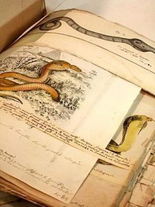 Ensemble d'environ 200 feuillets de divers formats, brochés ensembles, qui sont des compositions originales ou des gravures représentant une large variété de reptiles et d'amphibiens, en grande majorité aquarellées avec soin à la main et complétés de notes scientifiques manuscrites sur chaque espèce représentée.
