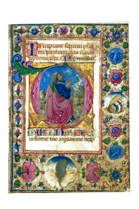 • Les sept Pseaumes de la pénitence (f. 36-43), débutant par une grande initiale sur fond or montrant David (quelques éclats), dans un encadrement semé de fleurs roses ou bleues, en médaillon un papillon, et un singe vu de dos devant une ville à l'horizon.