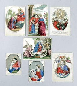 FRANCE, XVIIème_x000D_ Ensemble de 7 images pieuses imprimées sur vélin, coloriées et rehaussées d'or. _x000D_