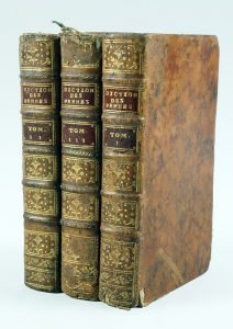 Tome III : nombreux arrachements de cuir, coiffes usées, trous de ver à la reliure, déchirure à la page de titre)