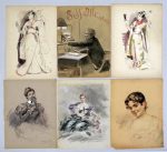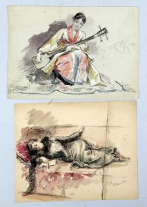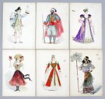 Lucien LOPEZ-SILVA (né en 1862). Suite de 21 dessins figurant des costumes, scènes de genre, soldat, projet de publicité pour une lampe de table électrique (Self allumeur), étude de chiens. Aquarelle et encre de Chine. Env 26 x 20 cm