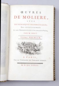MOLIÈRE. Œuvres de Molière avec des remarques grammaticales ; des avertissemens et des observations sur chaque pièce, par M. Bret. Paris, Compagnie des Libraires associés, 1773. 5 vol in-8 (manque tome IV) veau marbré, dos lisse orné,...