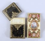 Le tout placé dans un étui en maroquin noir imitant une reliure, dos lisse orné, filets et petits fers en encadrement et large fleuron doré au centre des plats.
