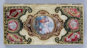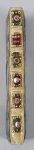RELIURE ORNÉE datée 1756. In-12 (10,5 x 5,4 cm.), veau crème à médaillons peints, dos à nerfs, pièce de titre datée de 1756, entrenerfs ornés de pièces de maroquin bordeaux ou brunes centrées d'un petit disques de mica coloré, plats...