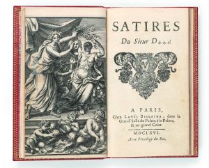 *[BOILEAU-DESPREAUX (Nicolas)]. Satires du Sieur ***. Paris, Louïs Billaine, 1666. In-12, maroquin rouge, dos à nerfs orné de fl eurons et caissons dorés, encadrement de deux fi lets sur les plats, roulette intérieure, tranches dorées, étui...