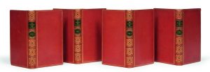 4 volumes in-12: maroquin brique, triple filet doré en encadrement des plats, dos à nerfs ornés, pièces de titre, de tomaison et petits médaillons mosaïqués de maroquin vert, coupes filetées, roulette intérieure, tranches dorées sur marbrure (David).