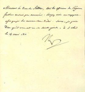 «Monsieur le Duc de Feltre, tous les officiers des Régiments frontières ne sont pas nommés. Envoyez moi un rapport afin que je les nomme sans délai. Sur ce, je prie Dieu qu' il vous ait en sa Sainte garde. «
