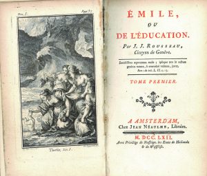 *ROUSSEAU (Jean-Jacques). Émile, ou de l'éducation. Amsterdam, Jean Néaulme [Paris, Duchesne], 1762. 4 volumes in-12 de 1 frontispice, (1) f. de titre, VIII pp., (1) f., 466 pp.; 1 frontispice, (2) ff., 407 pp.; 1 frontispice, (2) ff., 384 pp.; 1...