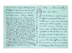 Commentaires sur l'absentéisme des gardes nationaux, l'indignité de la ligne, l'exécution présumée des généraux Leconte et Clément Thomas, par Gabriel. Ensemble de lettres de l'architecte Oscar H. de La Chardonnière à sa femme, certaines écrites dans les interlignes au jus de citron: «C'est bien triste de voir que la troupe fait cause commune avec l'émeute et que la garde nationale ne marche pas ne sachant pas pour qui et avec qui elle est» (19 mars)... échange entre la romancière Nelly Lieutier (1829-1900, tante de Pierre Loti) et son père, le Dr Besson à Angoulême (jusqu'en juillet), sur le désOeuvrement des gardes nationaux, les barricades, la foule insouciante, le refus de la troupe d'intervenir, l'effervescence révolutionnaire sans partage réel des idées... Lettre d'un député sur la sauvegarde de l'Assemblée à Versailles, l'arrivée de renforts, les hésitations de Thiers, la crainte de voir les Prussiens intervenir pour rétablir l'ordre dans Paris, «dernière humiliation» (19 mars). Lettres d'un garde national évoquant les fautes et maladresses de l'Assemblée, le résultat des élections du 26: «inouï! 8 ou 10 noms un peu connus & recommandables. Les autres 80 inconnus, ou trop connus tels que Blanqui, Flourens, & jusqu'à Raoul Rigault! (Fou, mais pas méchant)» (27 mars)...