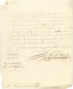 LETTRE DE LA CAMPAGNE DE PRUSSE ET DE POLOGNE, à son camarade d'armes désireux d'un nouvel emploi [Pille était alors inspecteur Général des détachements de conscrits]. Il a reçu sa lettre et son mémoire pour l'Empereur : " Je me suis empressé de le faire passer à Sa Majesté ; croyez, mon cher Général, que ce qui vous intéresse ne peut m'être indifférent, & je saisirai la première entrevue que j'aurai avec l'Empereur pour lui parler de vous. Si Sa Majesté n'a pas encore accédé à votre vœu je solliciterai de ses bontés une décision qui vous soit favorable, & vous pouvez compter que je ne manquerai pas de faire valoir le zele qui vous anime "...