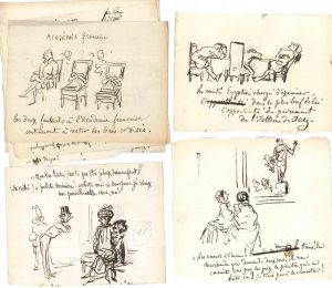 Amédée de Noé, dit CHAM (1819-1879) caricaturiste. 10 DESSINS originaux à la plume avec légendes autographes ; 1 page in-12 chaque (environ 12 x 15 cm).