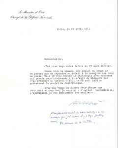 Il n’a pas le temps de répondre à sa question, mais envoie la photocopie du « discours que j’ai prononcé au Conseil d’État le 28 août 1958 en présentant le projet de Constitution » (photocopie jointe : La Nouvelle Constitution) ; il ajoute de sa main : « Je me permettrai de vous renvoyer à un ouvrage que j’ai rédigé il y a déjà quelques années Au Service de la Nation ».