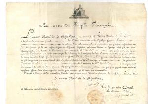 BREVET de commissaire Général des relations commerciales de la République française à Lisbonne, pour le citoyen Philibert Mathieu SERURIER, avec ordre de s'y rendre, et injonction aux " Négocians, Capitanes, Maîtres, Patrons et Equipages, ainsi qu'à tous autres Français résidans dans l'étendue du Commissariat, de reconnaître le Cen Serrurier en la qualité qui lui est donnée "...