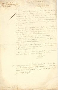 " Comme vous ignoriez à l'ordre de qui il falloit passer ces traites, vous vous êtes contenté de mettre votre nom au dos ; et pour opérer votre décharge, j'en ai fait remplir l'endossement comme suit : "Payez à l'ordre de M. Garat commis du grand comptant du Trésor Royal, valeur du Paquebot n° 11, vendu pour le compte du Roi, à Bordeaux le 6 janvier 1789" au moyen de quoi cette affaire se trouve entièrement terminée. Je ne puis que vous témoigner ma satisfaction sur le zèle que vous avez apporté dans cette occasion pour les interets du Roi "