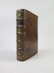 Reliure plein cuir, les mors sont usés avec manque, tranches salies, dos à 5 nerfs, caissons ornés de fleurons dorés, titre en lettres dorées dans une pièce de cuir marron.