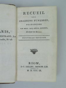 BOSSUET, Recueil des oraisons funèbres, Éditions Salles, Riom, 1809, in-12, 327 pages.