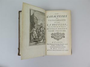 BRUYERE LA, Les Caractères, notes de Coste chez Michel, Éditions Etienne David, 1776, in-12. Deux volumes. Reliure plein cuir, dos à 4 nerfs, fleurons dorés dans les caissons