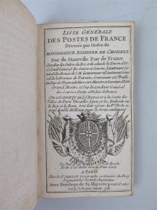 CHOISEUL MONSEIGNEUR ÉTIENNE DE, Liste Générale des postes de France, Éditions Jaillot, Paris, 1765, in-16 Contient une carte de France en très bon état.