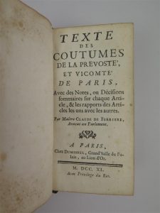 FERRIÈRE CLAUDE DE, Textes des coutumes de la prevoste et Vicomte de Paris, chez Dumesnil, Paris, 1740, in-16, 283 pages + 28 pages de table.