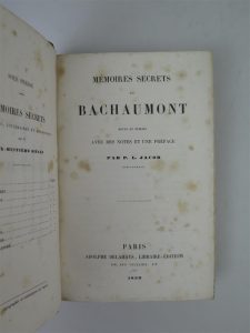 JACOB PAUL LOUIS, Mémoire secrets de Bachaumont, Éditions Delahays, Paris, 1859, in-12. Demi-reliure cuir verte, premier plat papier marbré vert, dos lisse orné de fleurons dorés, titre et auteur en lettres dorées.