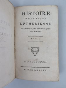MERCIER LOUIS SEBASTIEN, Histoire d'une jeune fille luthérienne, Neuchatel, 1786, in-12, tome 1 : 141 pages, tome 2 : 130 pages. Deux tomes en un volume. Reliure plein cuir, dos à 5 nerfs, titre dans une pièce de cuir rouge, quelques rousseurs