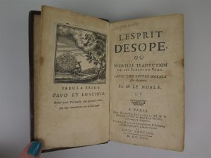 NOBLE LE, L'esprit d'Esope ou nouvelle traduction de ses fables en vers, Éditions Martin Jouvenel et Pierre Ballard, Paris, 1695, in-12. Ouvrage orné de 14 vignettes par Ertinger. Manque 2 fables et 3 dialogues.